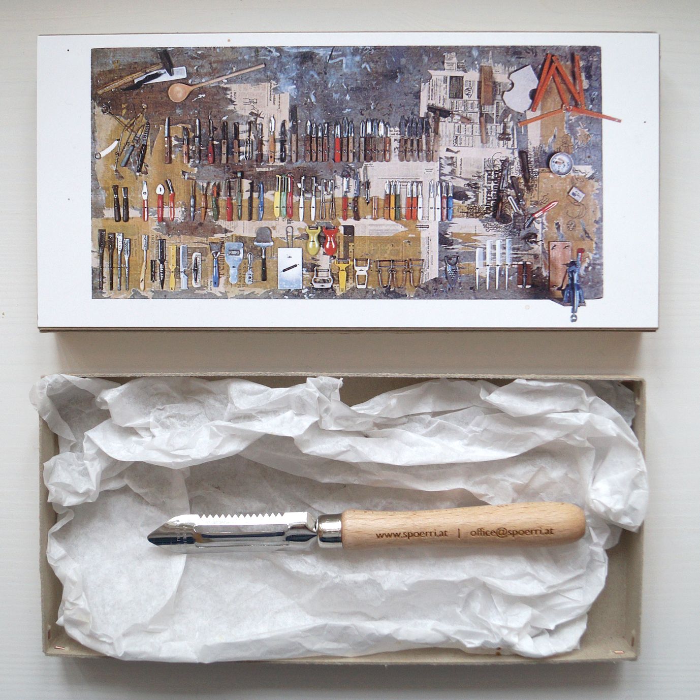 Potato peeler with art postcard in cardboard box