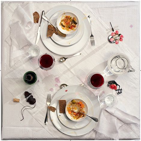 Paper print of a snare picture by Daniel Spoerri - often used as a "tablecloth" by the exhibition center at events